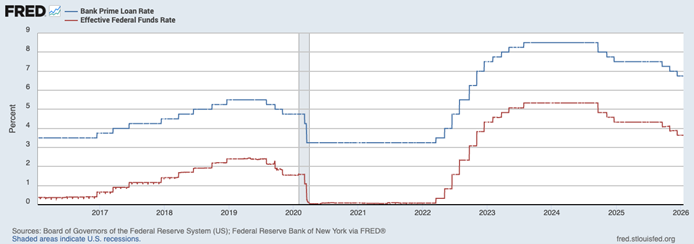 1Federal Reserve Bank of New York, Effective Federal Funds Rate [EFFR], retrieved from FRED, Federal Reserve Bank of St. Louis; https://fred.stlouisfed.org/series/EFFR, accessed January 19, 2026.